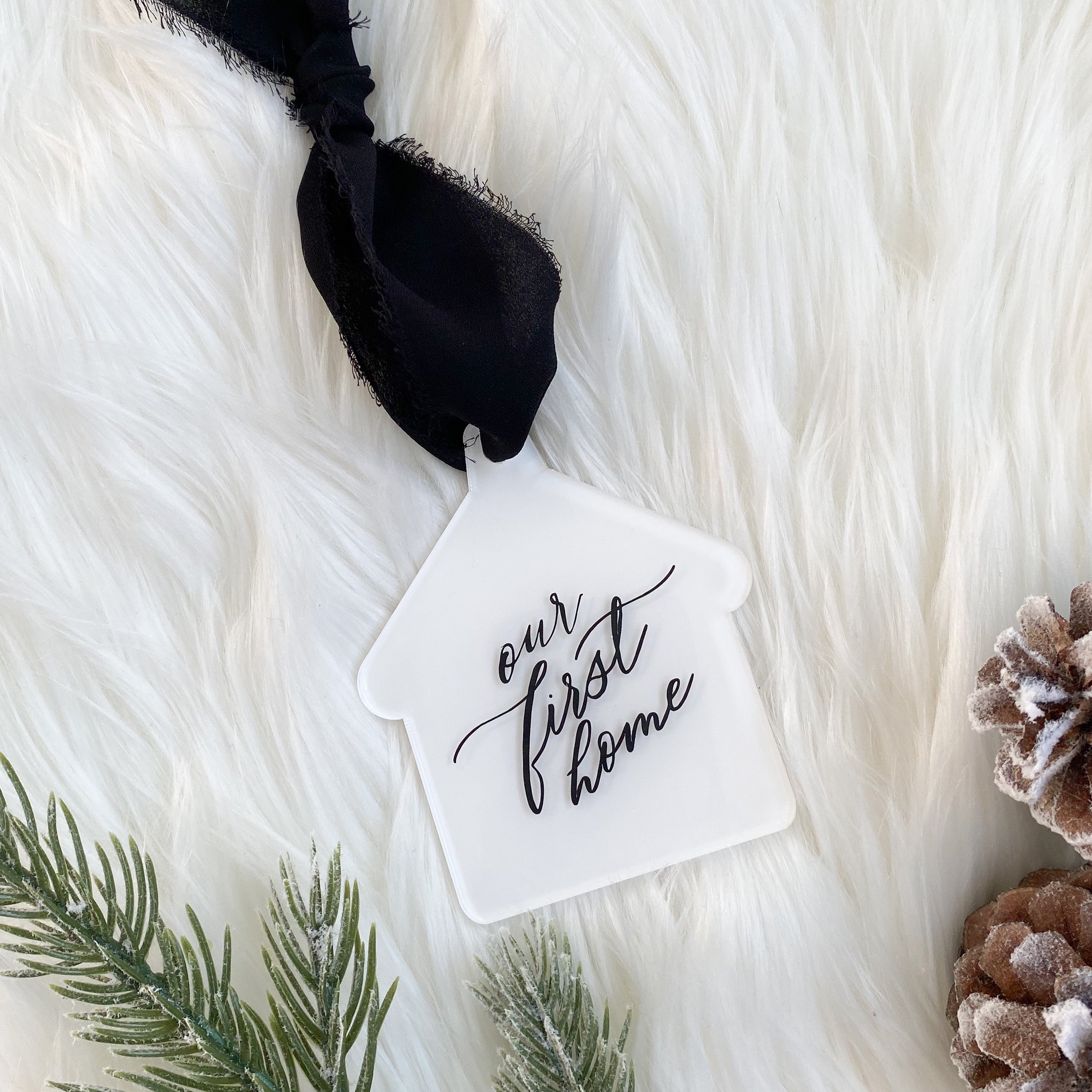 The "Our First Home" lettering is hand-drawn and cut from permanent acrylic. Each ornament is individually painted by hand.