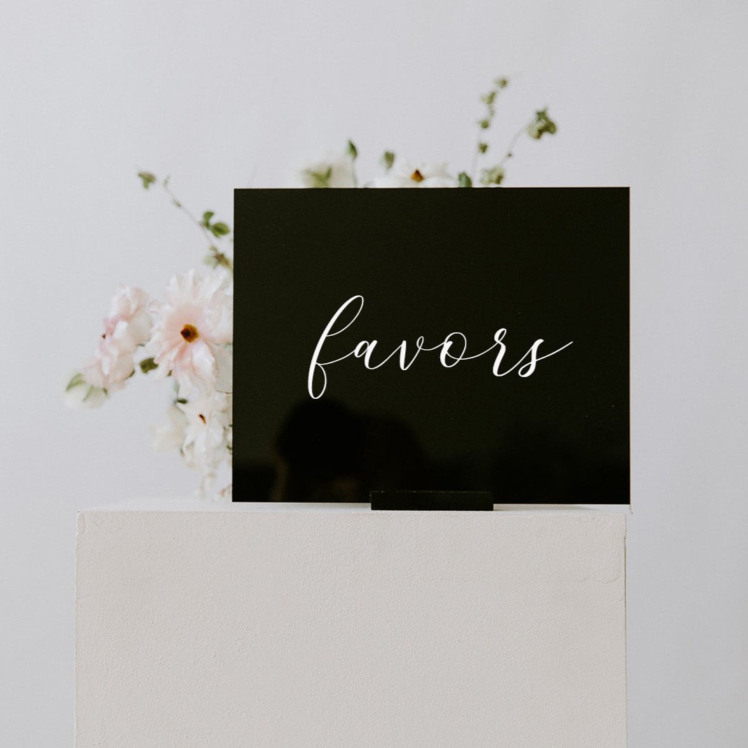 Crafted with great attention to detail and made from premium quality materials, our acrylic favors sign boasts a timeless design that effortlessly complements any event's theme. It's lightweight construction allows for effortless installation and portability, making it easy to move and display throughout your venue.