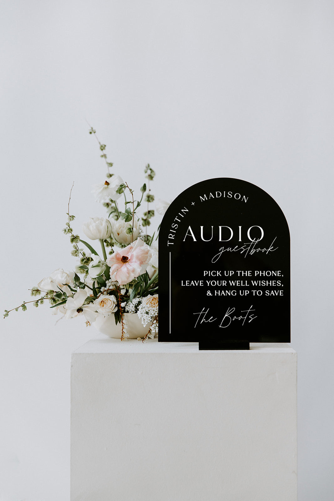 Crafted with great attention to detail and made from premium quality materials, our acrylic audio guestbook sign boasts a timeless design that effortlessly complements any event's theme. It's lightweight construction allows for effortless installation and portability, making it easy to move and display throughout your venue.